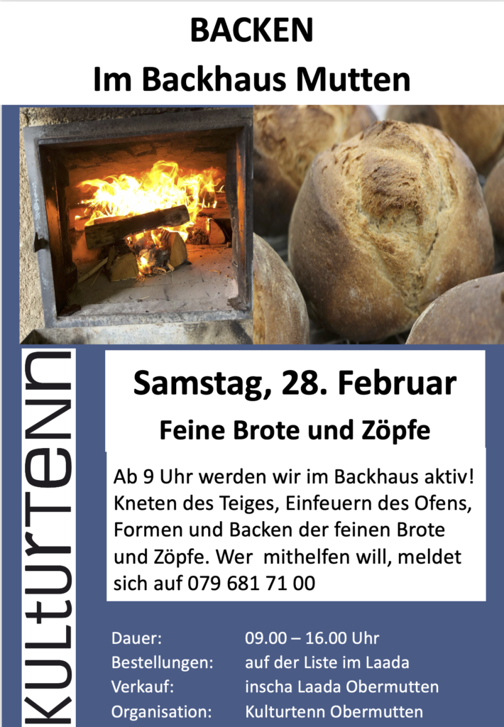 Holzofenbrote backen28. Feb. 202609:00 Uhr – 14:00 Uhr Im Backhaus Mutten backen wir Holzofenbrote und Zöpfe, Wer mithelfen will, meldet sich bitte bei Urs Nutt Anmeldung erwünscht an Urs Nutt 079 681 71 00
